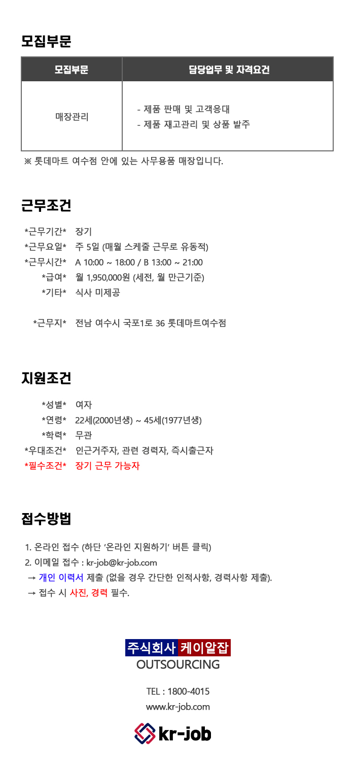 [Àü³² ¿©¼ö / ¿ù 195¸¸¿ø] ·Ôµ¥¸¶Æ® ¿©¼öÁ¡ Ò® »ç¹«¿ëǰ ¸ÅÀå Á÷¿ø ¸ðÁý