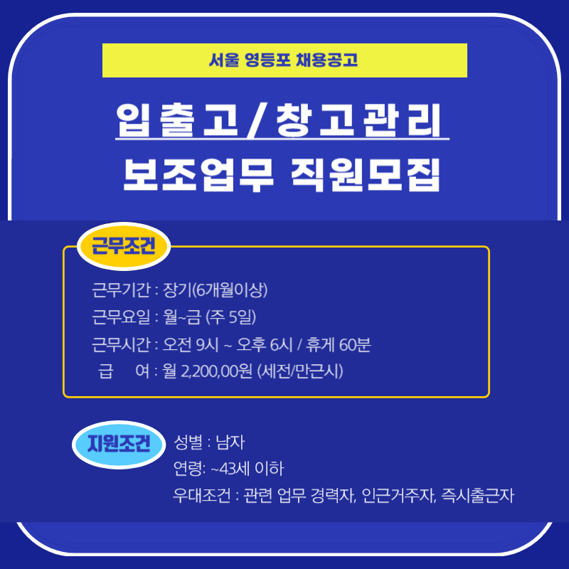 [¼¿ï ¿µµîÆ÷] ÀÔÃâ°í, â°í°ü¸® º¸Á¶¾÷¹« Á÷¿ø ¸ðÁý